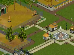 The goal of Zoo Tycoon is to create a thriving zoo by building exhibits to accommodate animals and keeping the guests and animals happy. Exhibit-building is one of the primary goals of Zoo Tycoon. To keep the guests and animals happy, exhibits should be suitable to the animal; for example, a lion is best suited to a savannah environment.[1] Choices in terrain, foliage, rocks, shelters, fences, toys and the presence of zookeepers all contribute to the suitability of an exhibit and the happiness of the animal. Guest happiness is dependent on animal choice, animal happiness, buildings, and scenery. Buildings include attractions, bathrooms, restaurants and food stands, gift shops, animal houses, such as insect houses, primate houses, reptile houses, nocturnal houses and aviaries, plant houses, petting zoos, and entertainment buildings such as movie theaters. Scenery involves aesthetics that raise guest happiness slightly, such as topiary art, light posts, and benches. Keeping both animal and guest happiness high allows the player to gain monetary awards and maintain a steady income. To help manage the expanding zoo, players can employ maintenance workers, zookeepers and tour guides. If the animals escape from their enclosures, they can attack and possibly kill guests and employees. Each of the animals have a predefined set of other species they can attack. If both species are placed in the same exhibit, the attacker will immediately run towards and attack the victim, a cloud of dust will appear shortly, and the animal will get killed. This behavior is not limited to carnivores, as some large herbivores are also able to kill other animals. Baby animals, with an exception for some dinosaurs, will normally not attack other animals. If too many animals are unhappy and the player receives complaints about them, they must fix their habitats or they will not adopt anymore animals.